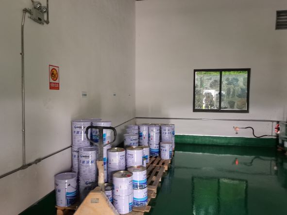 企業(yè)生產過程中使用的危險化學品為PU漆和UV漆。PU漆包括PU漆底漆、PU漆面漆、PU稀釋劑、PU漆固化劑,火災危險性均為甲類;UV漆包括UV底漆、UV面漆,火災危險性均為丙類。PU漆在噴漆工藝中使用,使用地點為3#廠房2層噴漆間內,共設有2個噴漆間。UV漆在輥涂工藝中使用,使用地點為3#廠房2層輥涂車間內,共設有2條輥涂生產線,另外,3#廠房2層設有1個調漆間。企業(yè)危險化學品儲存場所為廠區(qū)東南角的危險化學品倉庫,危險化學品倉庫分為2個隔間,分別儲存危險化學品和危險廢物,廠區(qū)內未設置危險化學品中間倉庫。